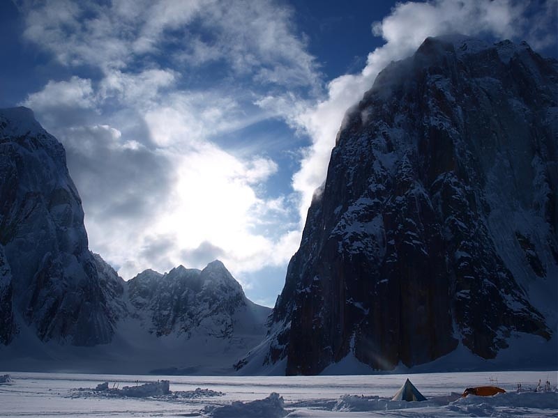 Lodowiec Ruth jest nieprawdopodobnym miejscem! Ogromne ściany na wielkiej przestrzeni, które wydają się mniejsze niż są w rzeczywistości. Ale zacznę od początku. Tym razem wylosowaliśmy dobrą kartę. Zaraz po miękkim lądowaniu w biały puchu okazało się, że dzień wcześniej skończyło się dość spore załamanie pogody i rozpoczął się kilkudniowy okres lampy! Pełni euforii i w pełnym słońcu od razu zabraliśmy się za kopanie obozu. W międzyczasie zasięgnęliśmy języka wśród biwakujących na lodowcu Norwegów. Mnie oczywiście najbardziej interesowała ściana Dickey’a , okazało się, że i tą mieli już dość dobrze obeznaną…