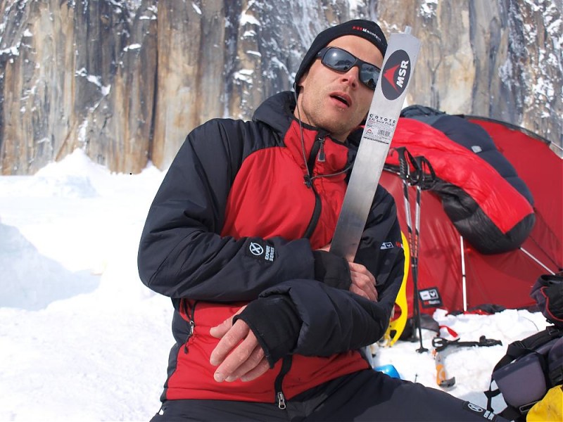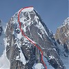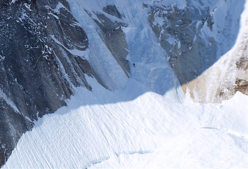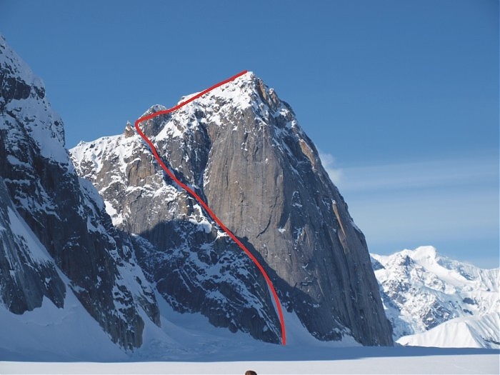 Z powodu wytopionego ze skały śniegu wejście w drogę było możliwe jedynie przez 50 m ścianę lodu WI4. Po jej przejściu terenem o nachyleniu 75 stopni doszedłem pod wąski mixtowy kuluar z miejscami WI4+, M4. Skąpa w tym sezonie ilość lodu oraz niezwiązany śnieg spowodowały pojawianie się kilku ciekawych miejsc. Pod jednym z nich skapitulował wspinający w tym okresie zespół amerykanów. Mt Johnson słynie ze słabej jakości skały, co muszę niestety potwierdzić. Po przejściu ok. 1000 m drogi i wyjściu na grań byłem przekonany, że wspinanie mam już za sobą. Jak się później okazało, byłem w błędzie. Na 200 m odcinku ostrej, wypchanej serakami grani napotkałem dwa skalne, kruche progi (V). Nieco wyżej z pozoru bezpieczny trawers ostrzem grani okazał się bardzo ryzykowny. W pełnym słońcu drastycznie wzrosło zagrożenie lawinowe. W takim miejscu dwójkowy zespół z lotną asekuracją nie doświadczyłby większych emocji, jednak dla mnie każdy błąd mógł skończyć się u podstawy ściany. Po 6,5 h od rozpoczęcia wspinaczki stanąłem na szczycie, było pięknie!. Po krótkim odpoczynku i łyku herbaty rozpocząłem zejście oraz eksponowane zjazdy wiszącym lodowcem do podstawy ściany.