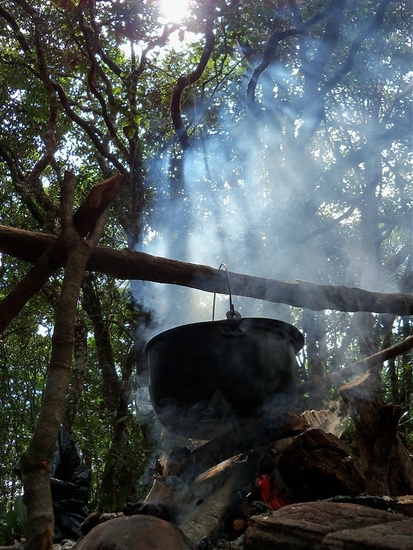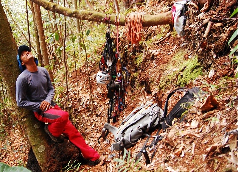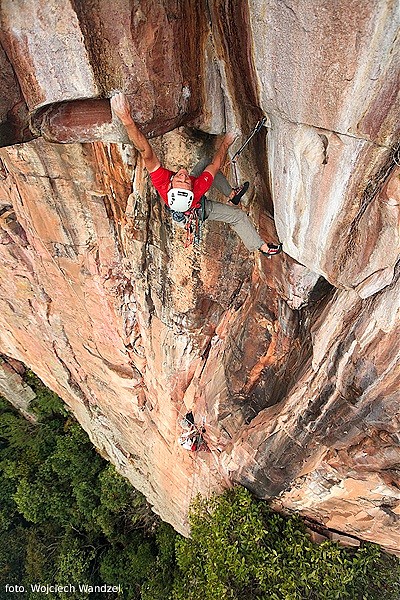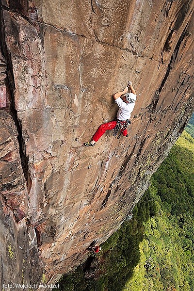 Na początku było podejście czyli przedzieranie się przez chaszcze. Wypuściliśmy przed siebie Leonardo (Indianin), który maczetą przedzierał szlak przez dżunglę. Nie wiedzieliśmy, w którą jej część uderzyć. Nie szukaliśmy najsłabszego punktu. Wręcz przeciwnie, poszukiwaliśmy wyzwania w największym jej spiętrzeniu. Naszą uwagę skupiły masywne okapy w samym sercu Tepui. Od chwili gdy rozpoczęliśmy wytyczanie drogi, zdaliśmy sobie sobie sprawę, jak inne jest to miejsce od tych, w których wspinaliśmy się do tej pory. Od samego początku droga żyła własnym życiem. Na każdym kroku stykaliśmy się z jej rezydentami. Pierwszy wyciąg stanowił łącznik z dżunglą, liany na przechodzonym przez nas wyciągu dochodziły aż do pierwszego stanowiska.